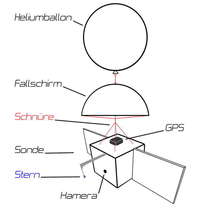 Die Sonde wird an einem Fallschirm befestigt, welcher mit einem Wetterballon verbunden ist.
